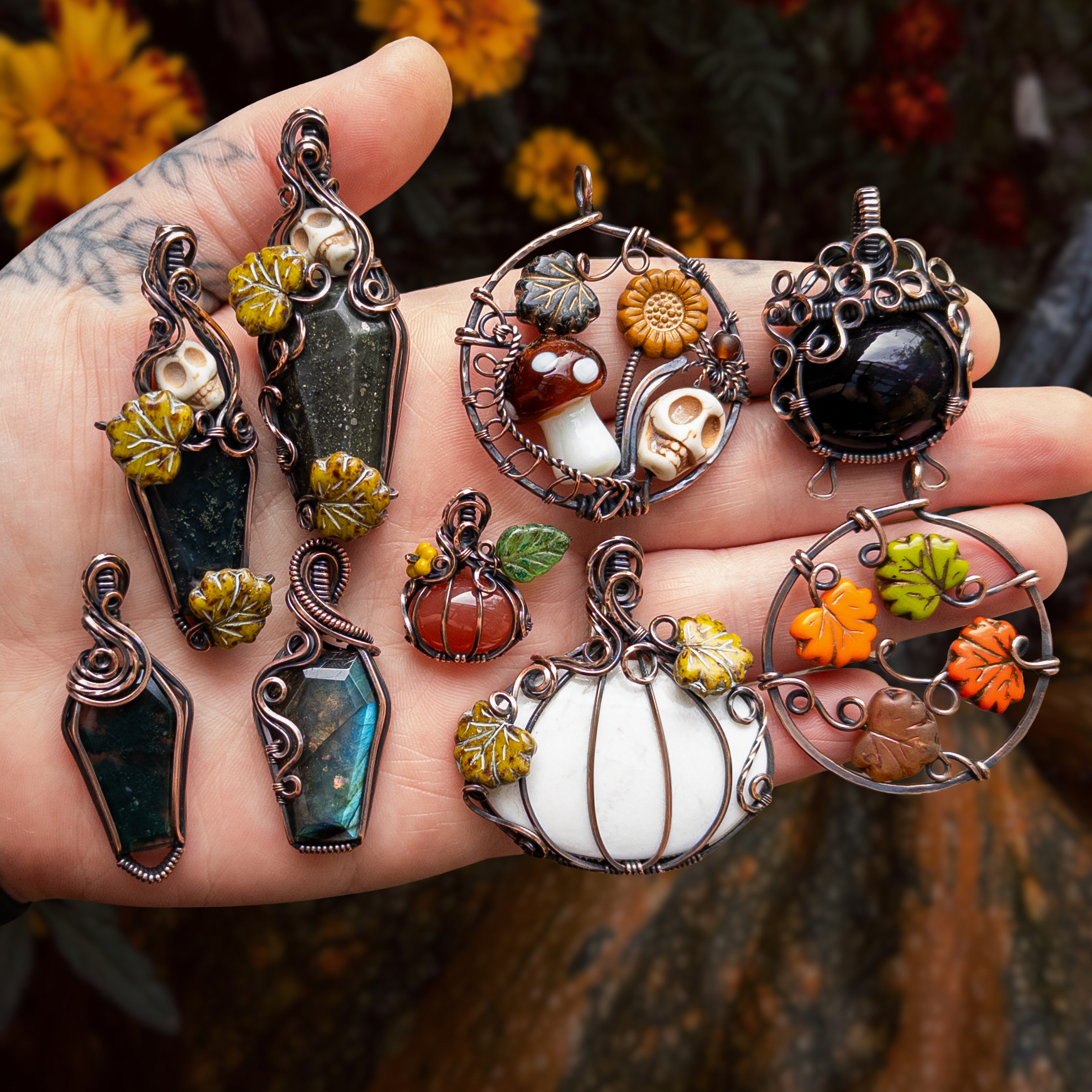 “Autumn Rest” Antiqued Copper Pendant With Czech Glass Botanical Beads, Lampwork Mushroom Bead, Stone Skull Bead, And Tiny Glass & Wire Spider