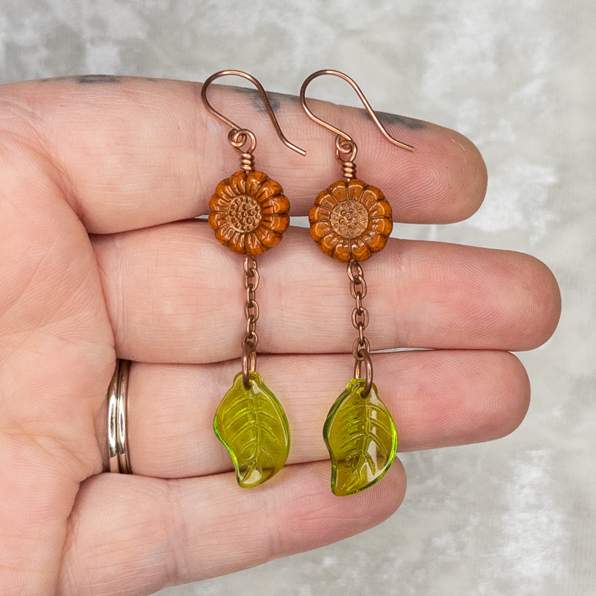 Czech Glass Sunflower & Glass Leaf Copper Earrings