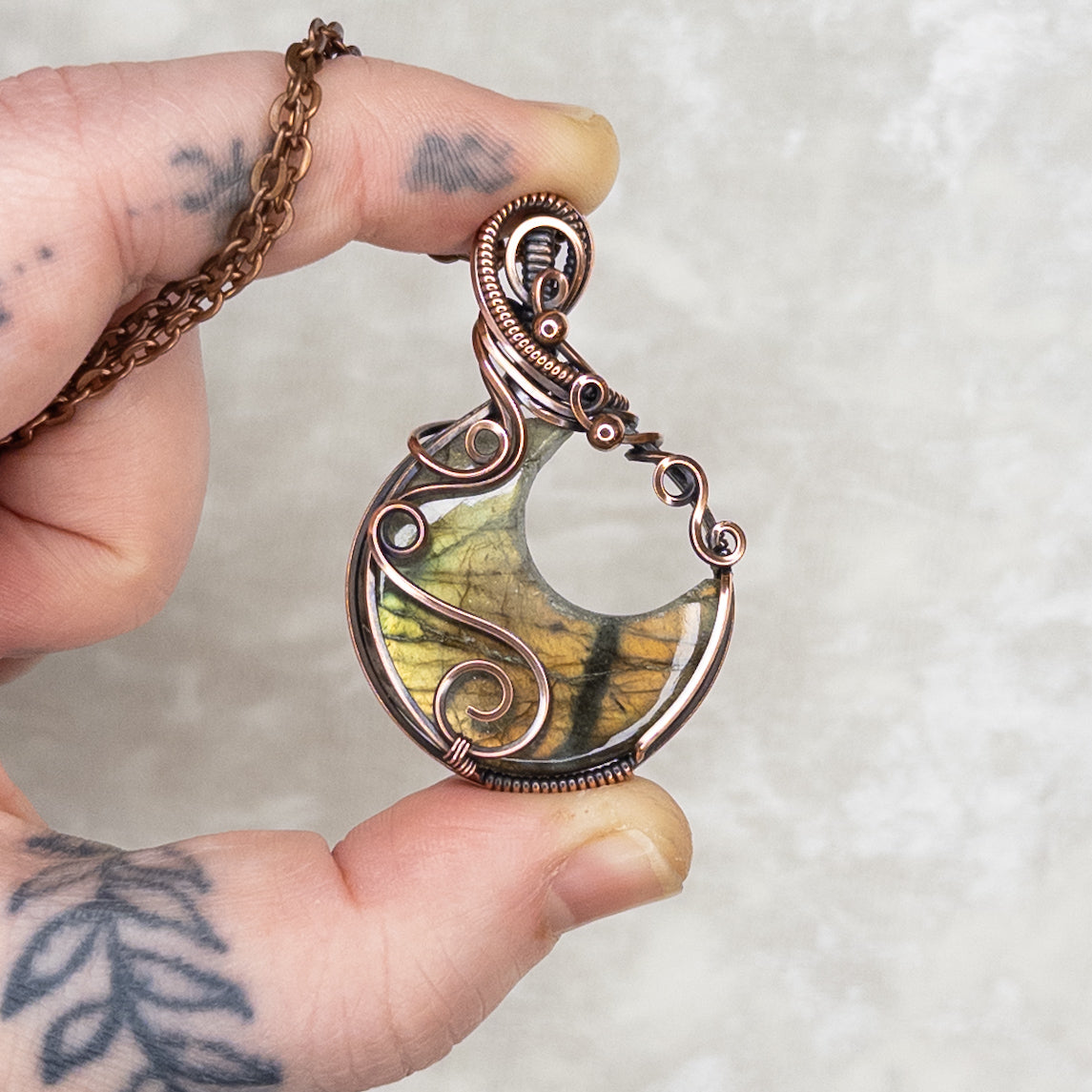 The wire will oxidize (tarnish) naturally over time. This process varies and can be influenced by the oils from someone’s skin, moisture in the air, or coming into contact with water/sweat/lotion/perfume. I include a polishing cloth so when you feel like the pendant needs brightened up gently rub the wire with the cloth to remove oxidization.