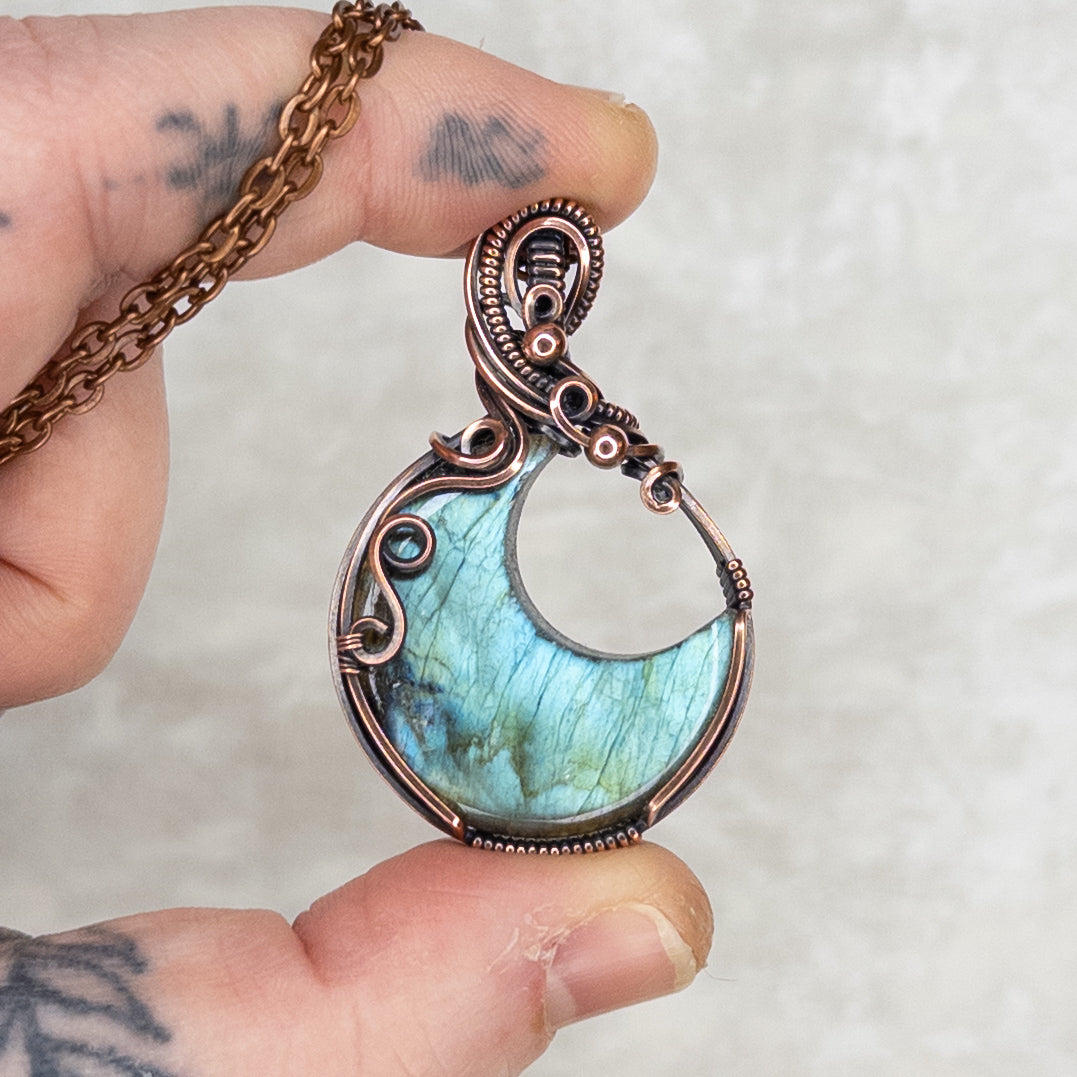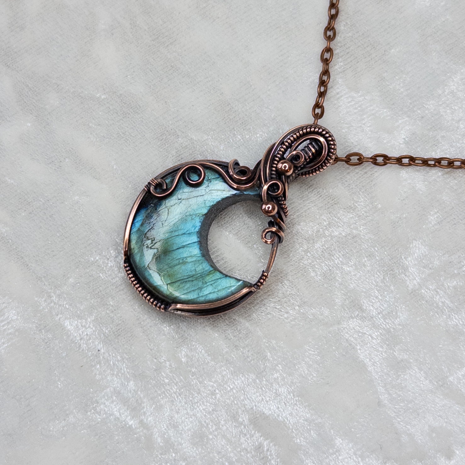 Light Blue Labradorite Moon Antiqued Copper Pendant