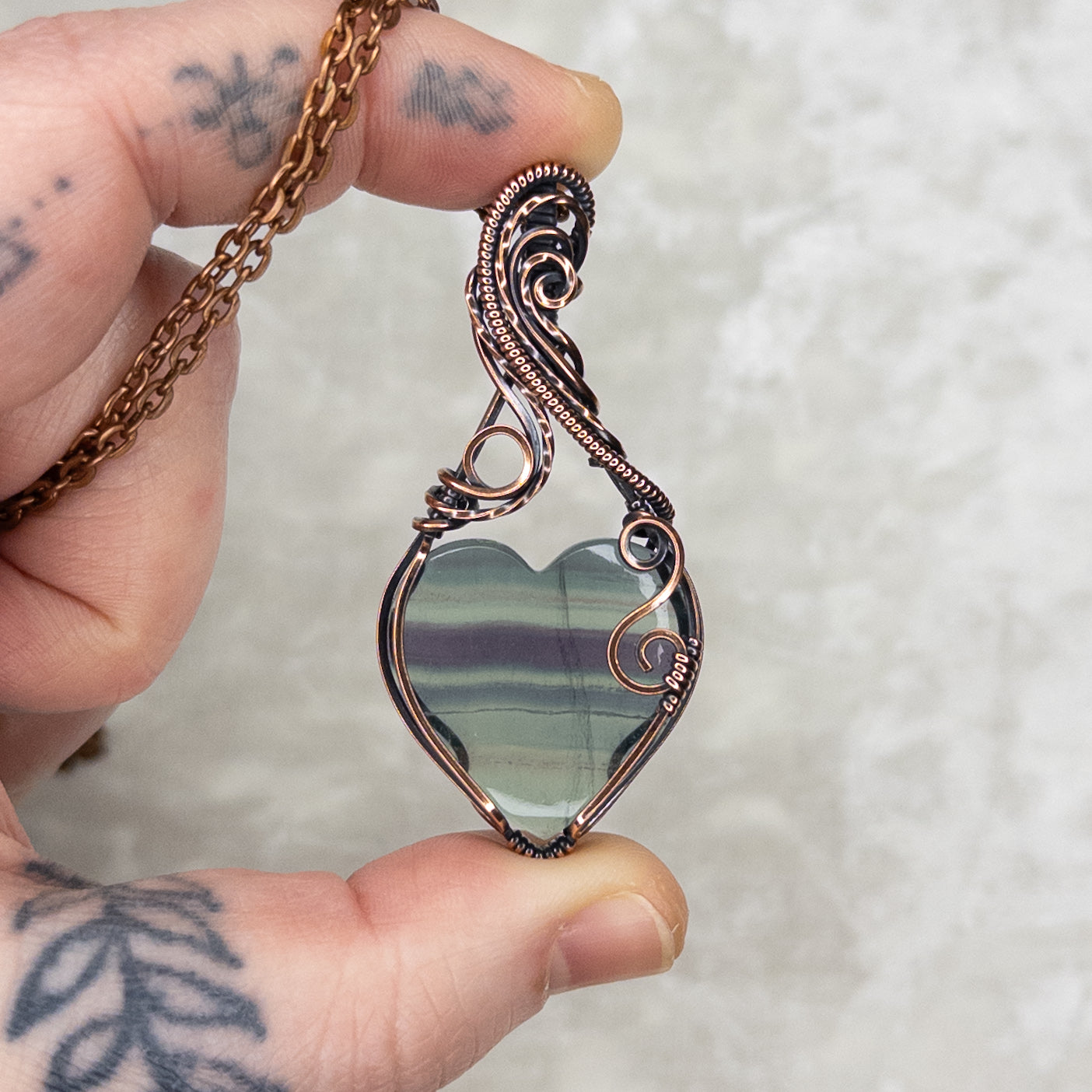 Banded Fluorite Heart Antiqued Copper Pendant
