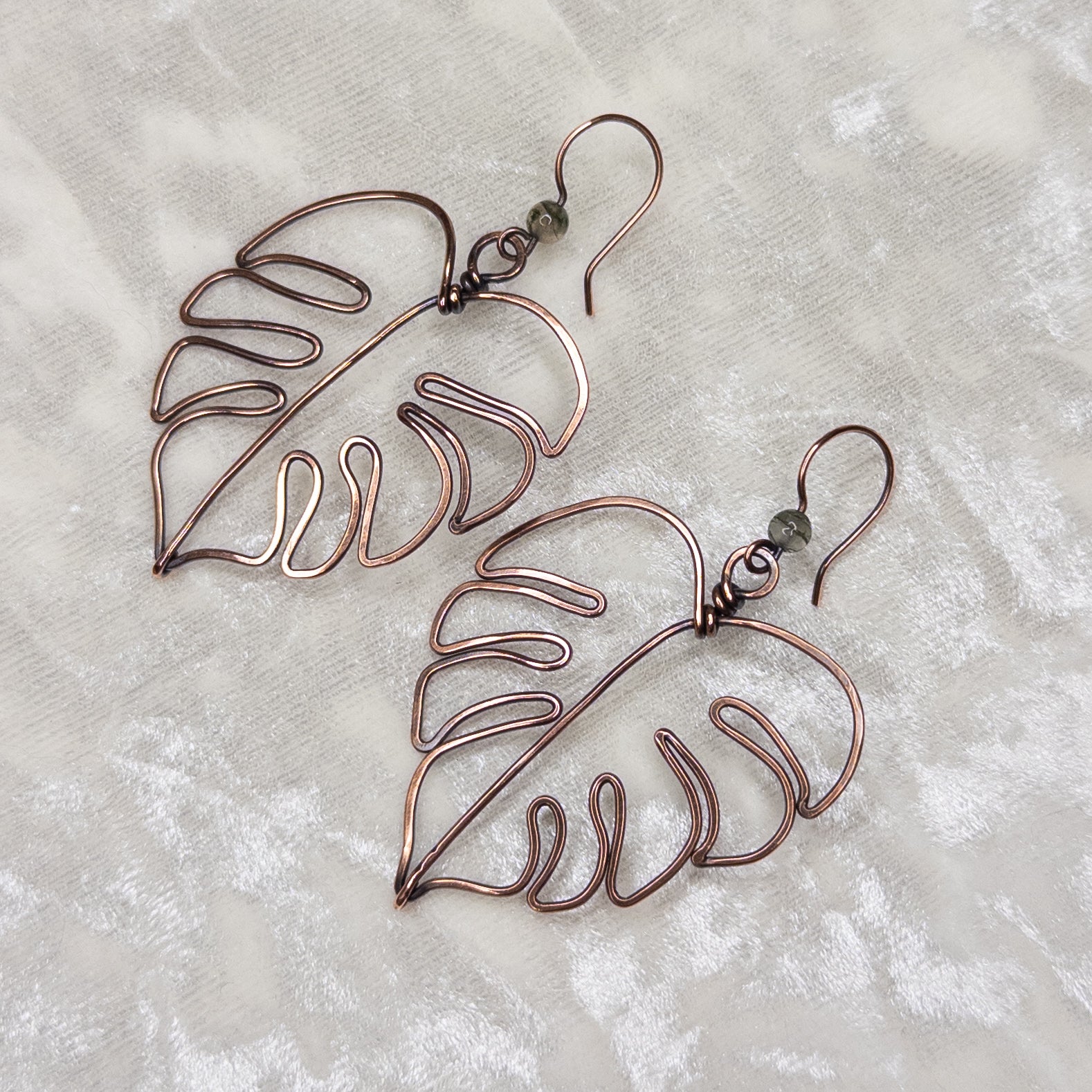 Moss Agate Hammered Monstera Leaf Antiqued Copper Earrings